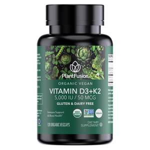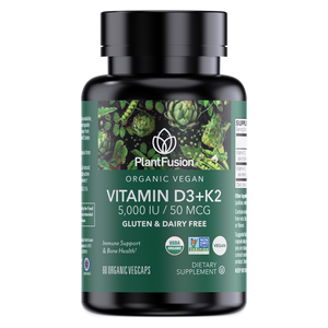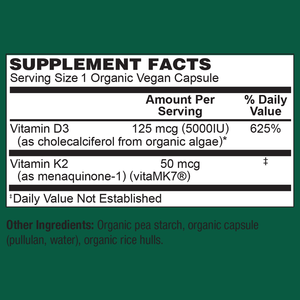 Our Organic Vegan Vitamin D3+K2 supplement combines the power of 5000 IU of Vitamin D3 with 50 mcg of Vitamin K2 to help promote healthy bones, cardiovascular function, and immune system strength.