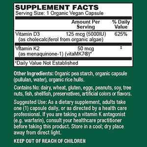 50MCG (5000IU) organic vegan vitamin D3 derived from algae with 50MCG K2 for immune support and bone health.