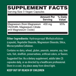 Magnesium Glycinate Complex, is highly bioavailable 400 MG blend of Magnesium Glycinate, Magnesium Citrate and Magnesium Oxide. (3 Vegan Capsules Per 400MG Serving)